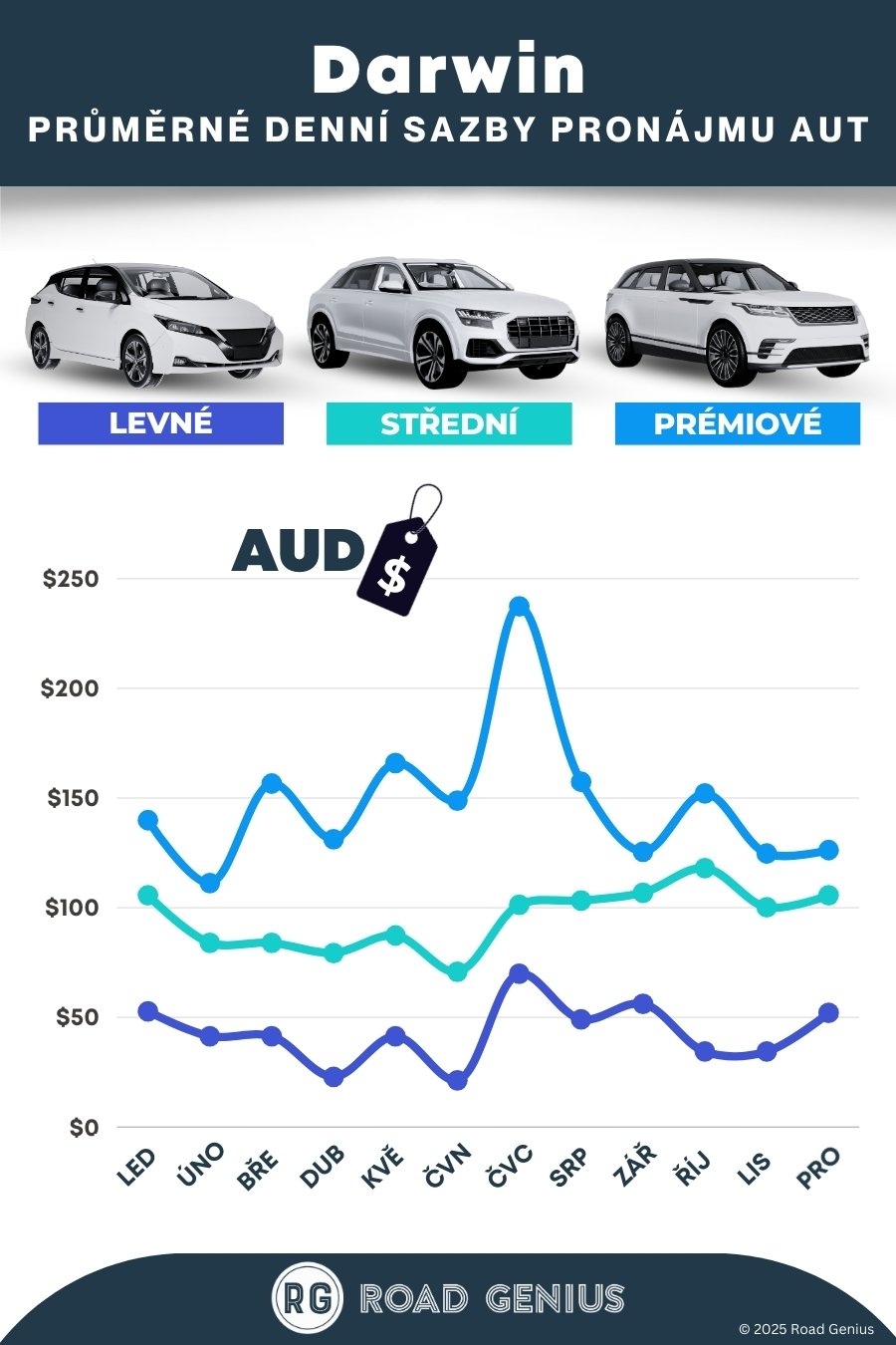 Pronájem auta v Darwinu stojí průměrně kolem 126 AUD na den, přičemž nejlevnější pronájmy začínají na 21 AUD za den.