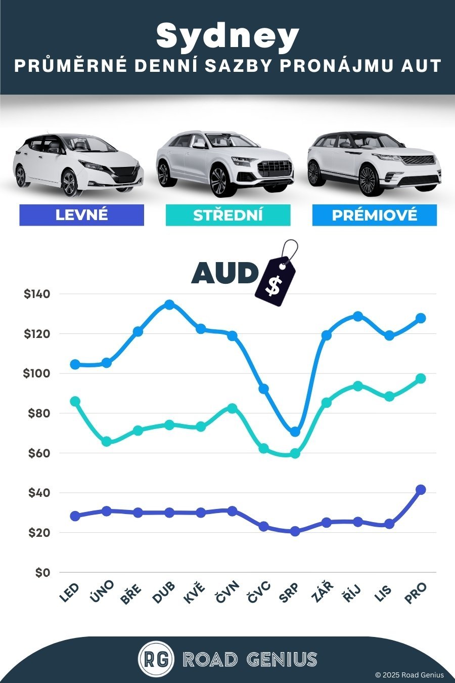 V průměru stojí pronájem auta v Sydney zhruba 97 AUD na den, přičemž nejlevnější pronájmy začínají na 21 AUD za den.
