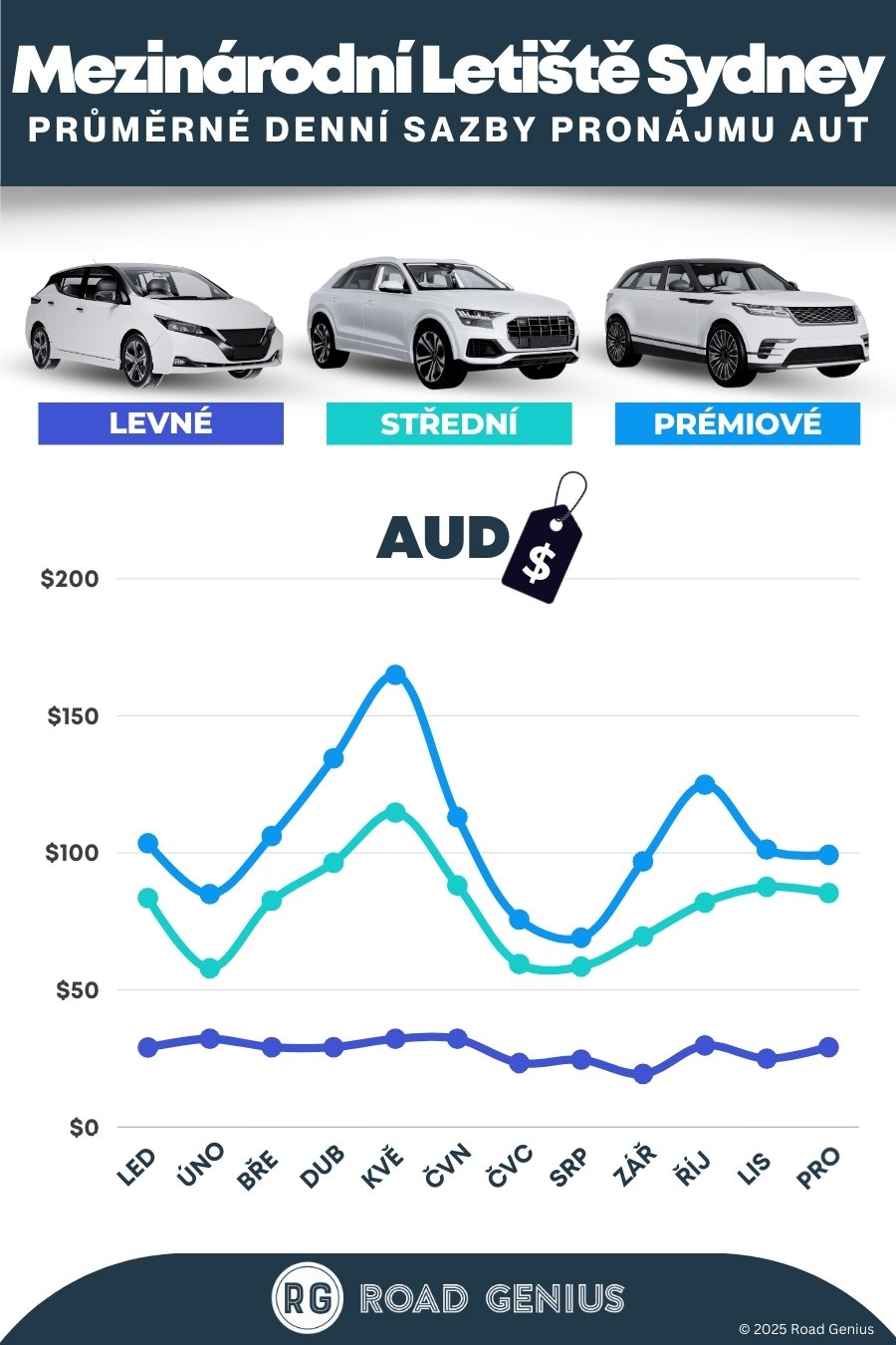 V průměru stojí pronájem auta na letišti v Sydney (SYD) přibližně 93 AUD za den, přičemž nejlevnější pronájmy začínají už od 19 AUD za den.