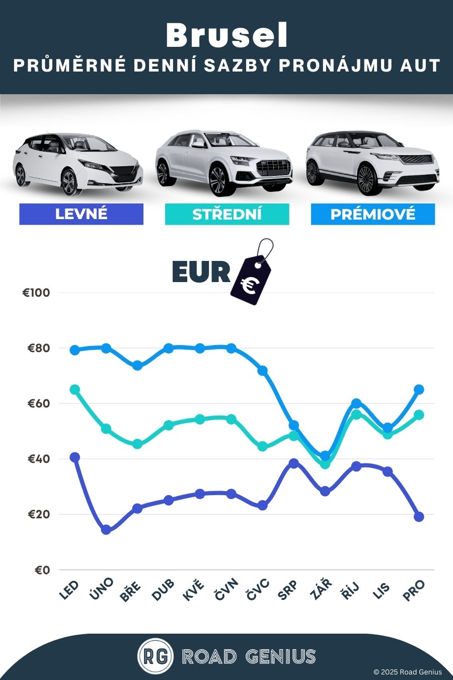 Průměrně stojí pronájem auta v Bruselu přibližně 49 € za den, přičemž nejlevnější pronájmy jsou k dispozici od 14 € za den.