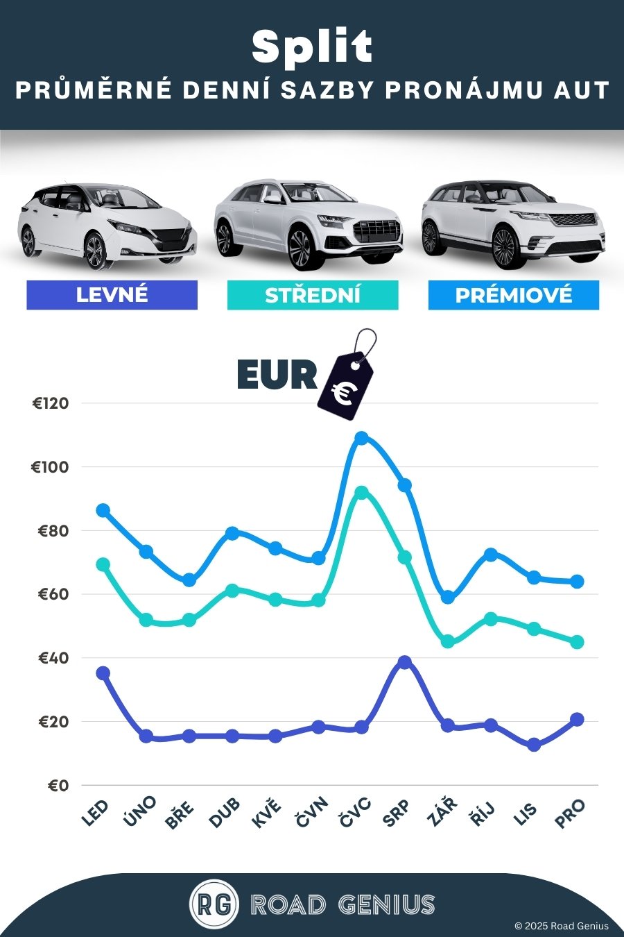Průměrně stojí pronájem auta ve Splitu přibližně 52 € za den, přičemž nejlevnější pronájmy jsou k dispozici od 13 € za den.