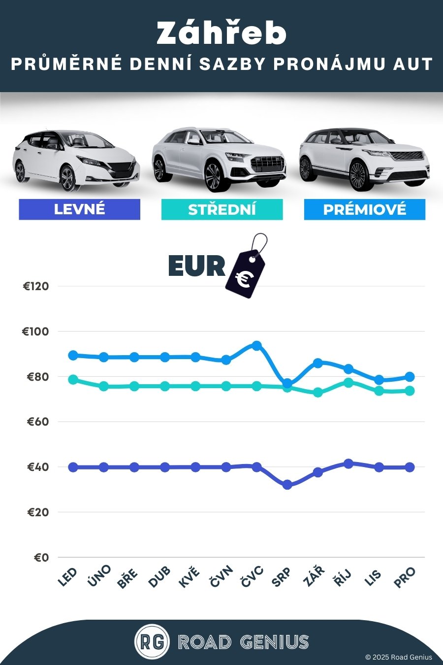 Průměrně stojí pronájem auta v Záhřebu přibližně 67 € za den, přičemž nejlevnější pronájmy jsou k dispozici od 32 € za den.