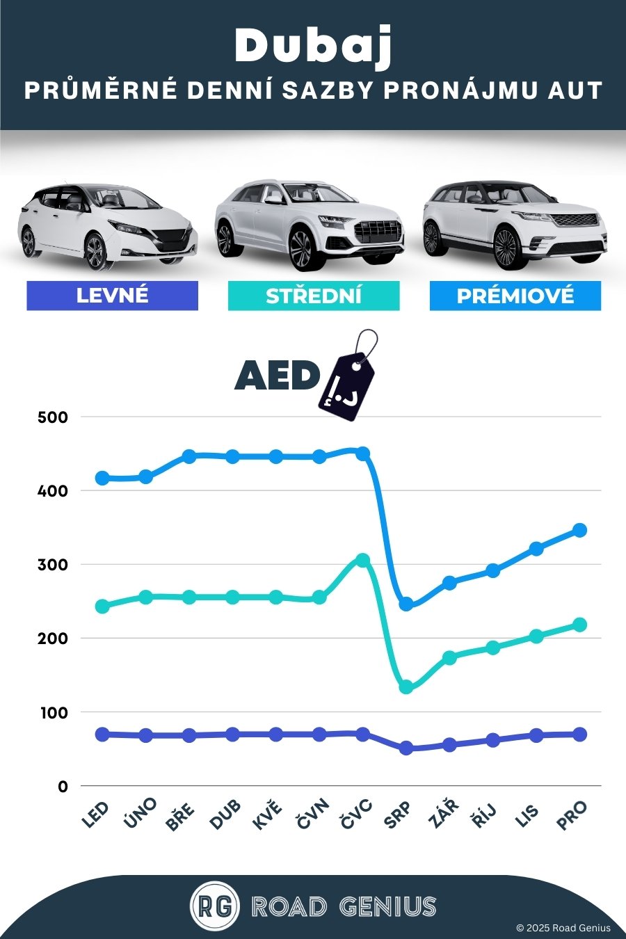 Průměrně stojí pronájem auta v Dubaji přibližně 224 AED za den, přičemž nejlevnější pronájmy jsou k dispozici od 51 AED za den.