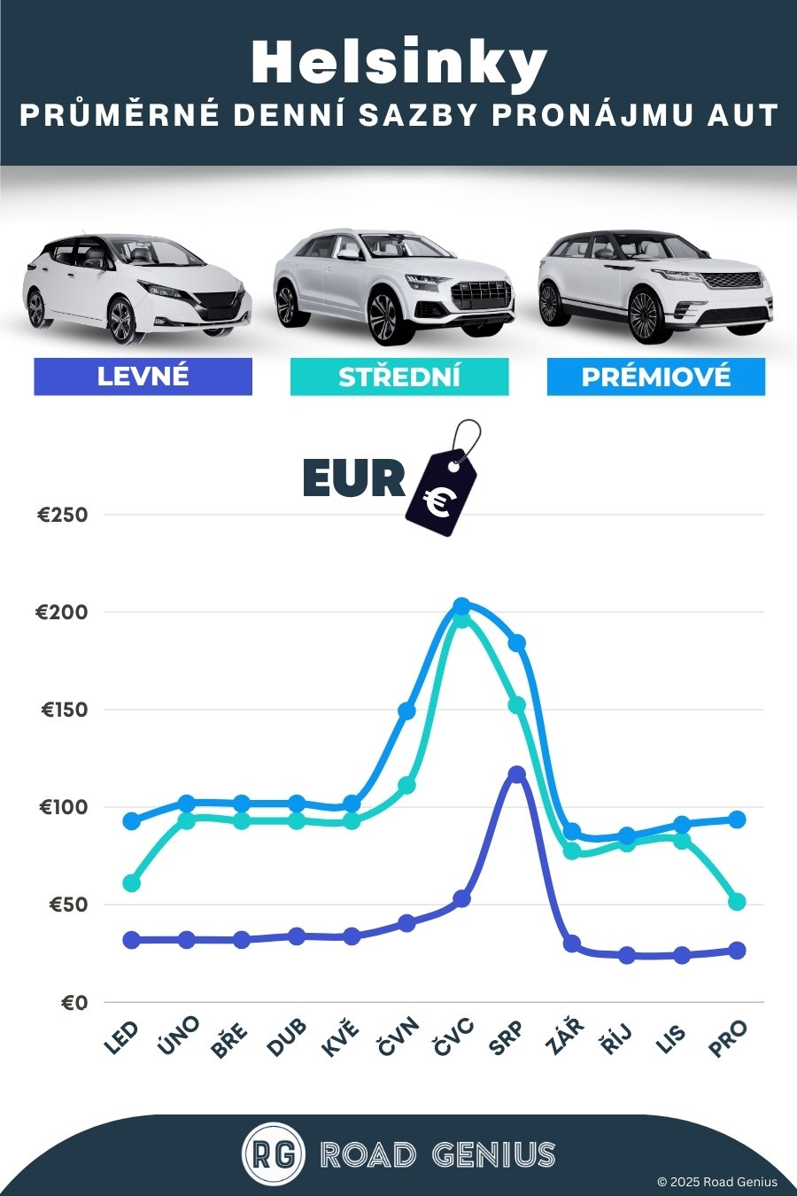 Průměrně stojí pronájem auta v Helsinkách přibližně 85 € za den, přičemž nejlevnější pronájmy jsou k dispozici od 24 € za den.