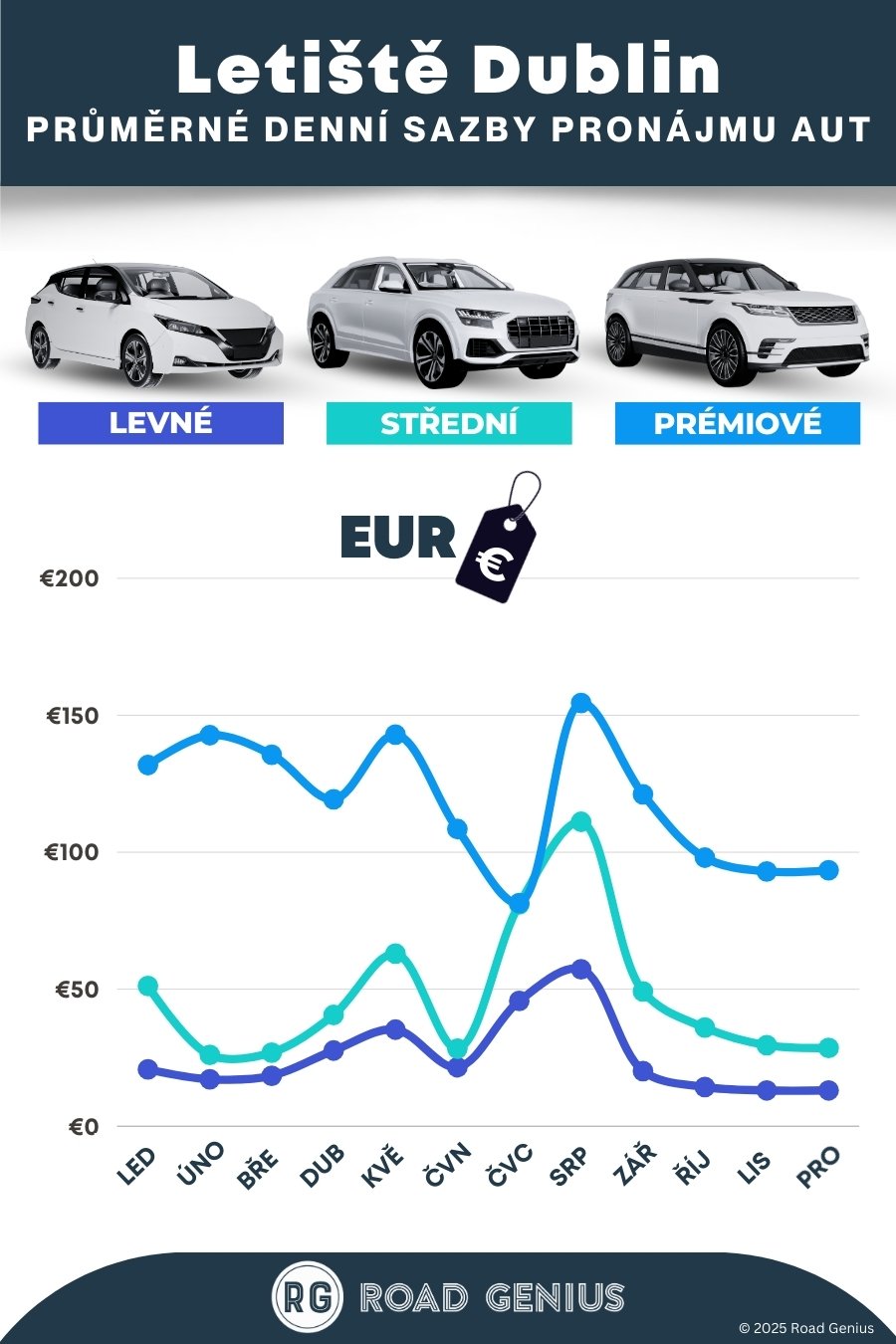 S Road Genius snadno najdete nejlepší ceny pronájmu auta na letišti v Dublinu. Porovnejte nabídky vozů SUV, hatchbacků nebo minivanů a rezervujte si auto bez rezervačních poplatků. V našem srovnání najdete všechny velké půjčovny jako Avis, Budget, Enterprise, Europcar, Hertz a Sixt, které mají pobočky v Terminálu 1, Terminálu 2 i v přilehlém centru autopůjčoven (Car Rental Village). Mezi terminály a centrem jezdí pravidelná bezplatná kyvadlová doprava a vrácení vozu je možné nonstop. Pokud plánujete cestu v létě nebo požadujete vůz s automatickou převodovkou, doporučujeme rezervaci s dostatečným předstihem. Přečtěte si také naše tipy na placení mýtného M50 eFlow a na jízdu do centra Dublinu.