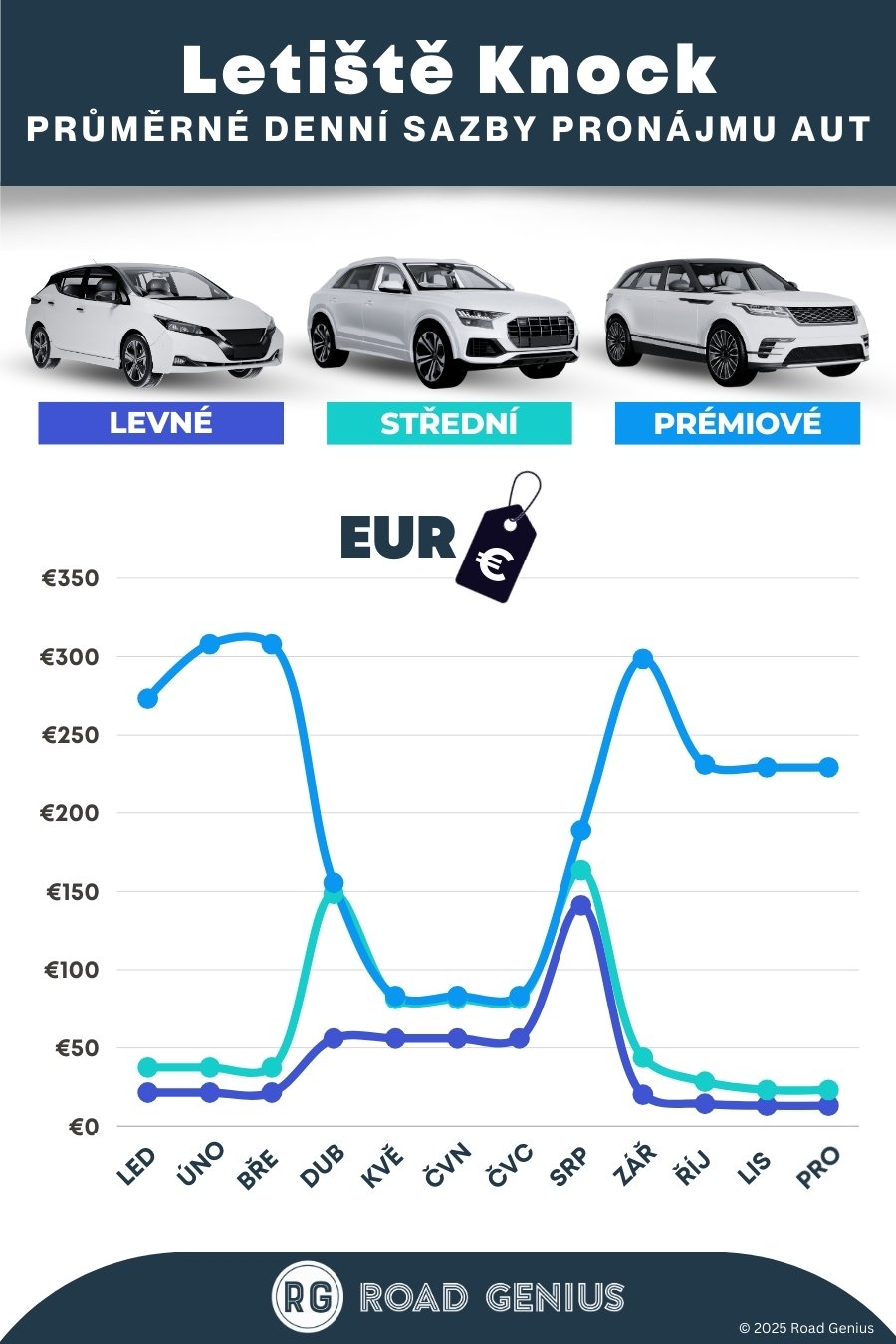 Průměrně stojí pronájem auta na Knock Airport přibližně 104 € za den, přičemž nejlevnější pronájmy jsou k dispozici od 13 € za den.
