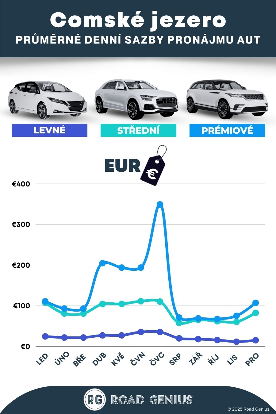 Průměrně stojí pronájem auta u jezera Como přibližně 81 € za den, přičemž nejlevnější pronájmy jsou k dispozici od 11 € za den.