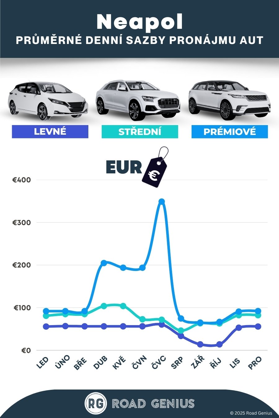 Průměrně stojí pronájem auta v Neapoli přibližně 86 € za den, přičemž nejlevnější pronájmy jsou k dispozici od 14 € za den.
