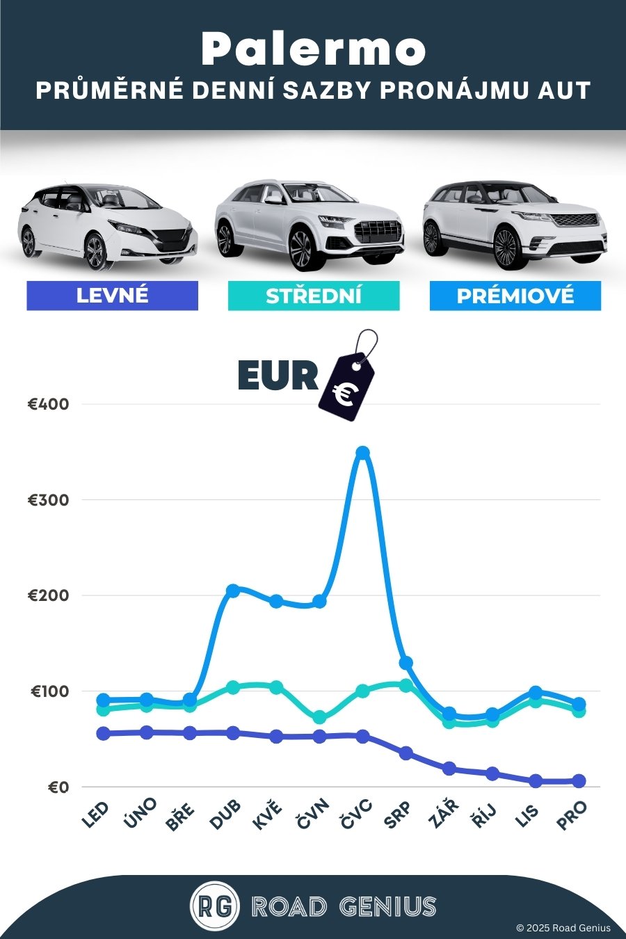 Průměrně stojí pronájem auta v Palermu přibližně 88 € za den, přičemž nejlevnější pronájmy jsou k dispozici od 6 € za den.
