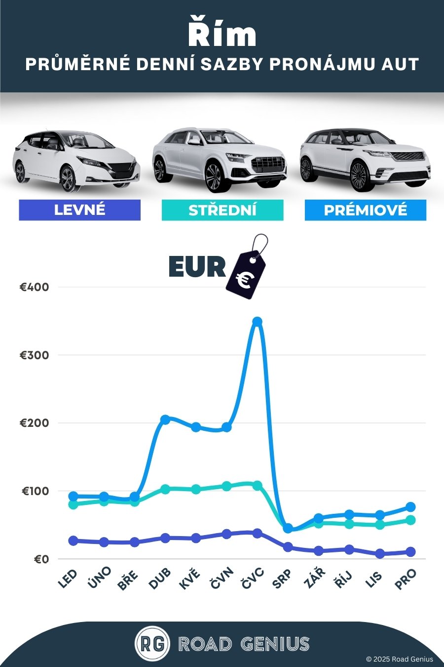 Průměrně stojí pronájem auta v Římě přibližně 76 € za den, přičemž nejlevnější pronájmy jsou k dispozici od 8 € za den.