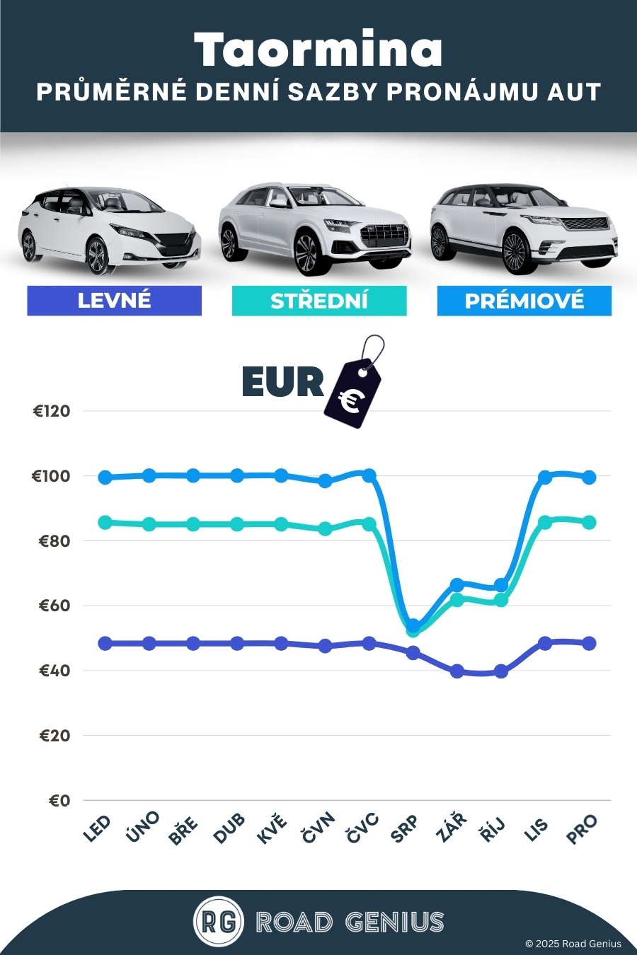 Srovnejte si nabídky předních půjčoven aut v Taormině na Road Genius. V naší nabídce najdete vše od cenově dostupných malých vozů až po prémiová SUV a minivany za skvělé ceny. Vůz si můžete vyzvednout přímo v Taormině, v nedalekém Giardini Naxos nebo na letišti v Catanii (CTA), které nabízí největší výběr a snadný přístup k Etně, Syrakusám a východnímu pobřeží. V létě doporučujeme rezervovat s předstihem, zejména pokud hledáte vůz s automatickou převodovkou. Nezapomeňte si také ověřit pravidla pro vjezd do zón s omezeným provozem (ZTL) a možnosti parkování, například v garážích Lumbi nebo Porta Catania.