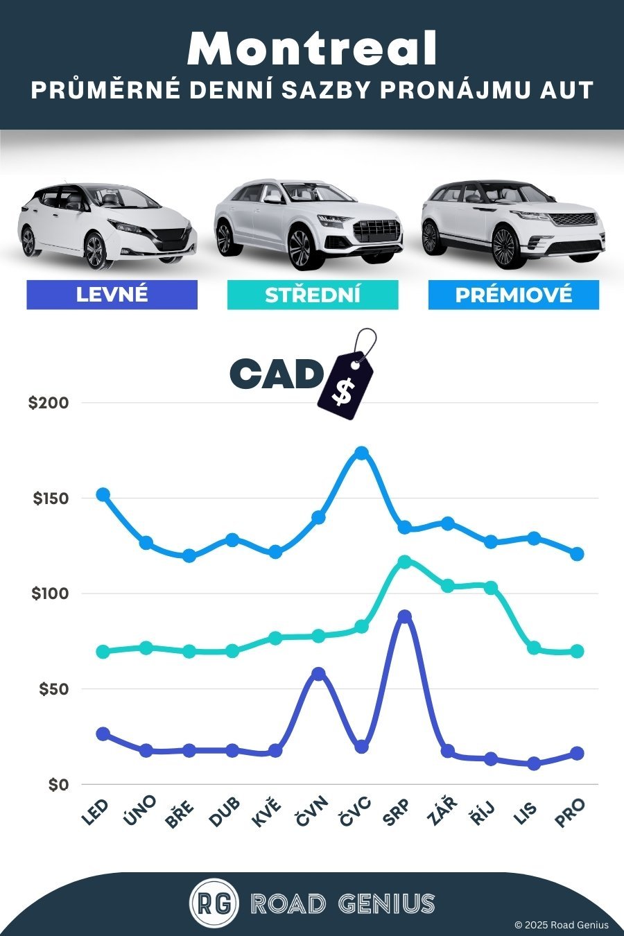 Průměrně stojí pronájem auta v Montrealu přibližně 81 CAD za den, přičemž nejlevnější pronájmy jsou k dispozici od 11 CAD za den.