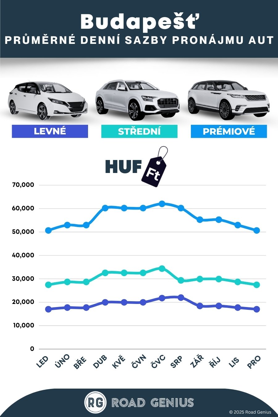 Průměrně stojí pronájem auta v Budapešti přibližně 35 103 HUF za den, přičemž nejlevnější pronájmy jsou k dispozici od 17 023 HUF za den.