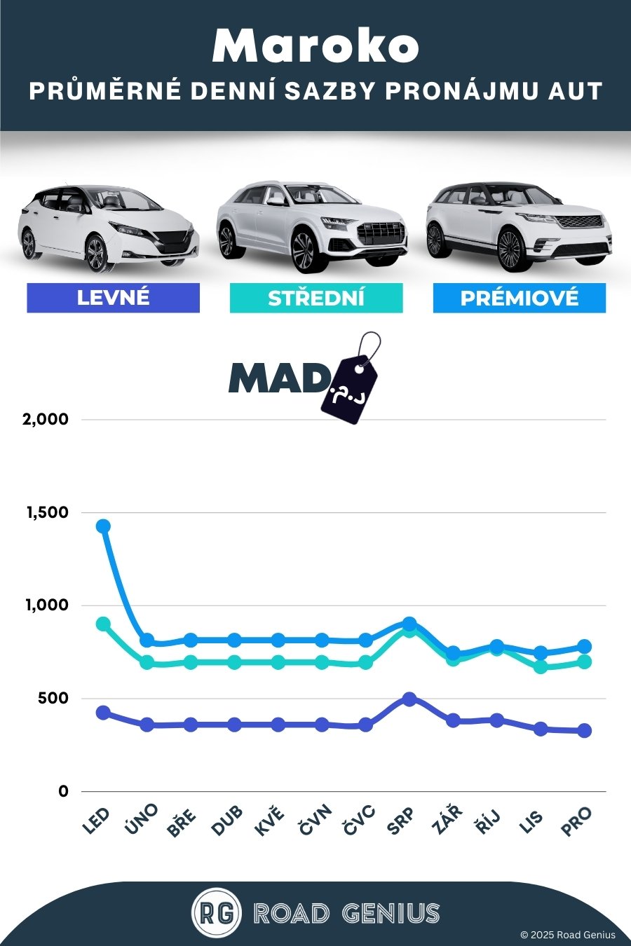 Průměrně stojí pronájem auta v Maroku přibližně 654 MAD za den, přičemž nejlevnější pronájmy jsou k dispozici od 328 MAD za den.