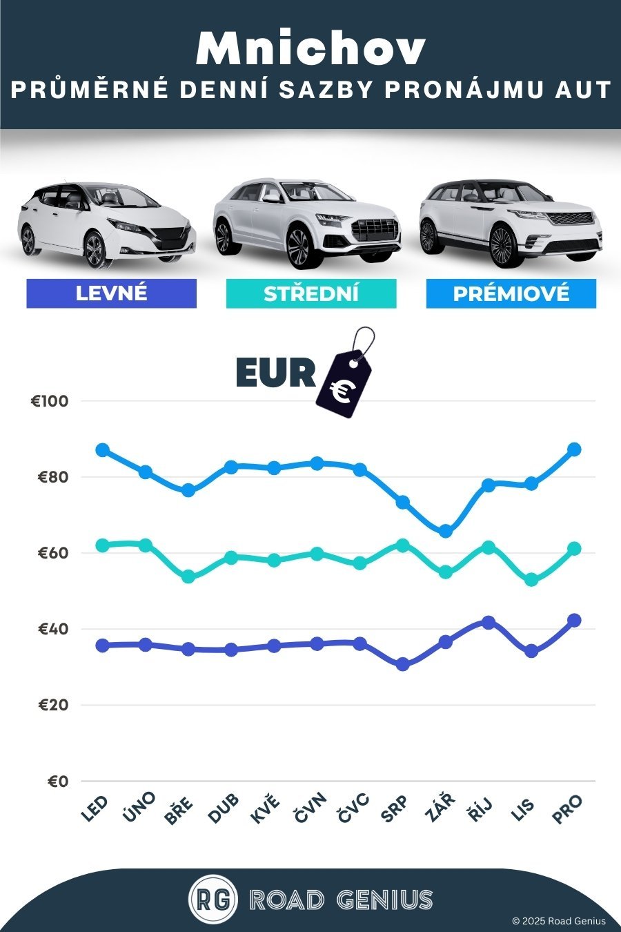 Průměrně stojí pronájem auta v Mnichově přibližně 58 € za den, přičemž nejlevnější pronájmy jsou k dispozici od 31 € za den.