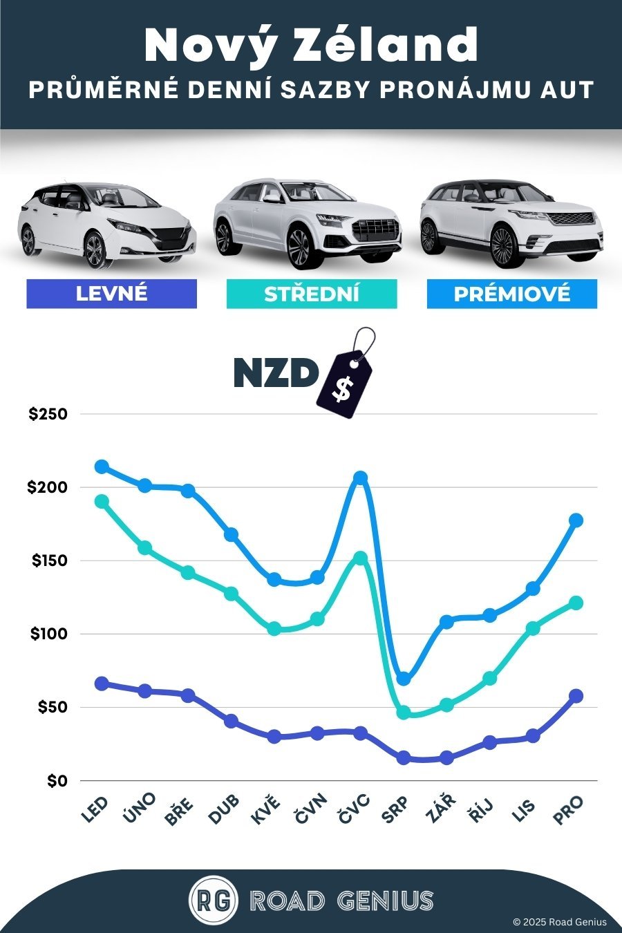 Průměrně stojí pronájem auta na Novém Zélandu přibližně 103 NZD za den, přičemž nejlevnější pronájmy jsou k dispozici od 16 NZD za den.