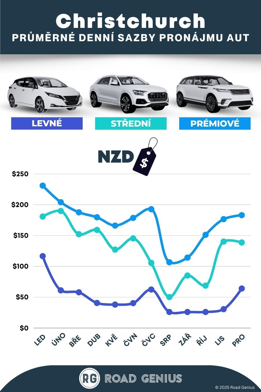 Průměrně stojí pronájem auta v Christchurchi přibližně 117 NZD za den, přičemž nejlevnější pronájmy jsou k dispozici od 26 NZD za den.