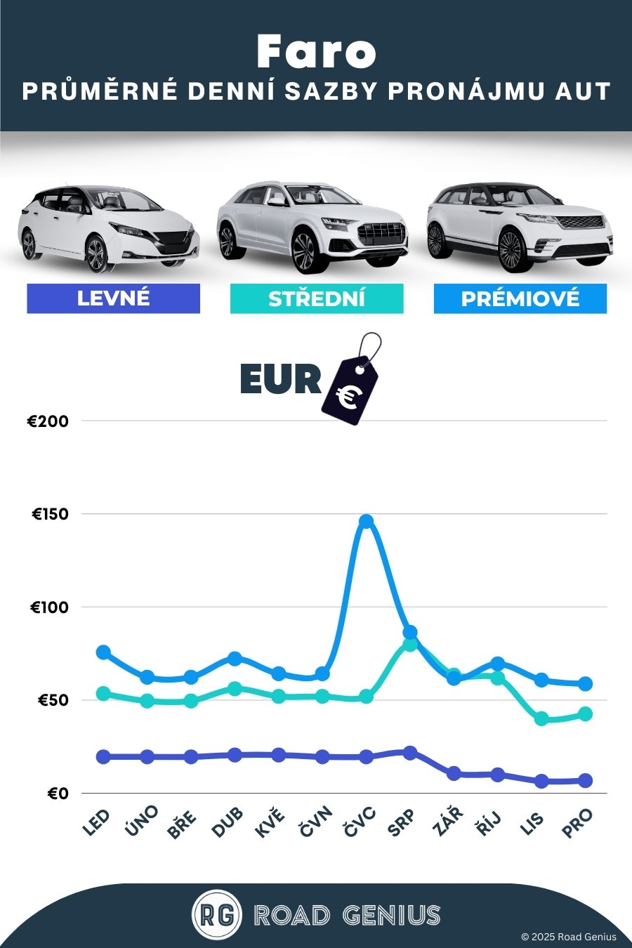 Porovnejte si s Road Genius ceny pronájmu aut od předních společností ve Faru. Na výběr jsou vozy za výhodné ceny, od kompaktních modelů až po prostorná SUV a minivany. Vůz si můžete vyzvednout na snadno dostupných místech, například na letišti Faro (FAO) nebo v centru města. Porovnejte nabídky mezinárodních značek s dobře hodnocenými místními půjčovnami a v létě si auto rezervujte s dostatečným předstihem, abyste se vyhnuli frontám. Plánujete cestu po Algarve? Mýtná jednotka vám usnadní a zrychlí průjezd po dálnici A 22. S menším autem zase snadněji zaparkujete v historickém centru a u pláží.