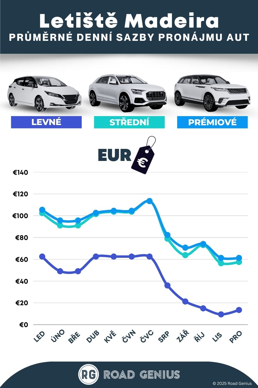 S Road Genius je půjčení auta na Madeiře snadné. Porovnejte si ceny vozů od mnoha půjčoven po celém Portugalsku bez rezervačních poplatků. Vůz si můžete vyzvednout na letišti Funchal (FNC) nebo přímo ve Funchalu a vybírat z nabídky místních i mezinárodních společností. Pro větší výběr a nižší ceny doporučujeme rezervovat s předstihem, zejména na léto, Vánoce a Velikonoce. Na místní strmé silnice se dobře hodí kompaktní vůz s automatickou převodovkou nebo menší SUV.
