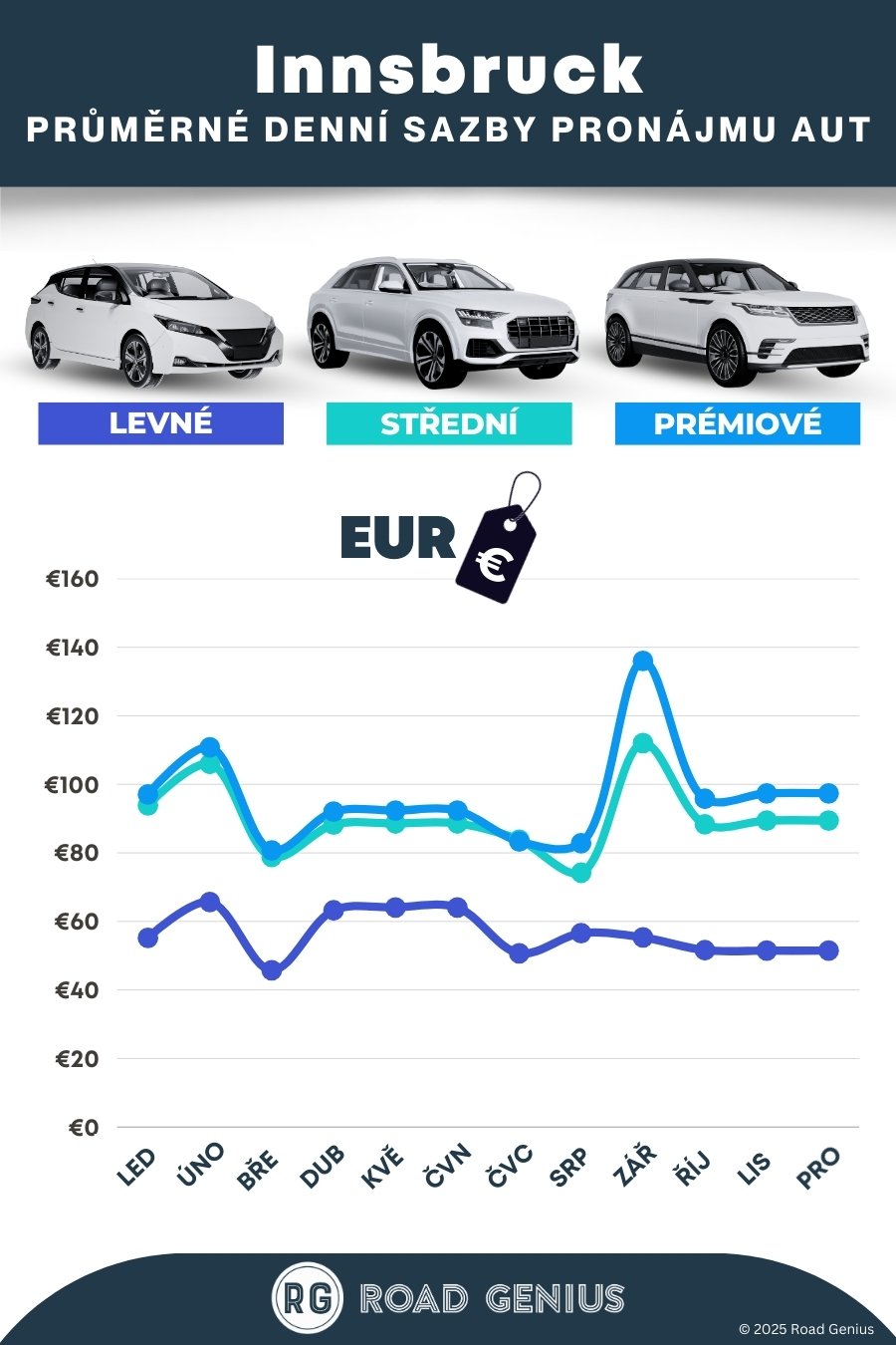Průměrně stojí pronájem auta v Innsbrucku přibližně 81 € za den, přičemž nejlevnější pronájmy jsou k dispozici od 46 € za den.
