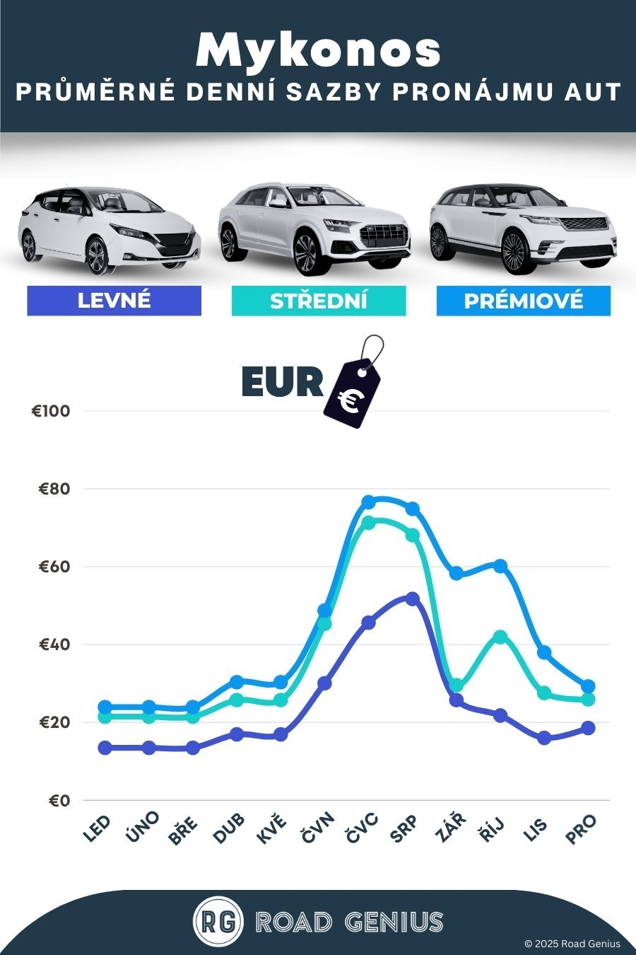 Průměrně stojí pronájem auta на Mykonosu přibližně 34 € za den, přičemž nejlevnější pronájmy jsou k dispozici od 13 € za den.