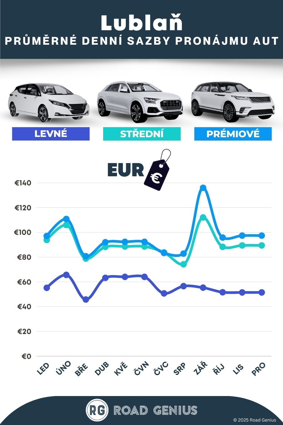 Průměrně stojí pronájem auta v Lublani přibližně 81 € za den, přičemž nejlevnější pronájmy jsou k dispozici od 46 € za den.