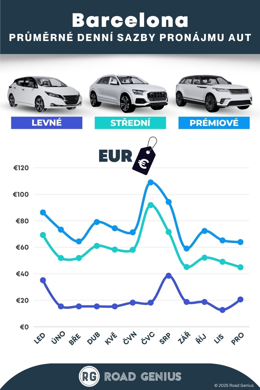 Průměrně stojí pronájem auta v Barceloně přibližně 52 € za den, přičemž nejlevnější pronájmy jsou k dispozici od 13 € za den.