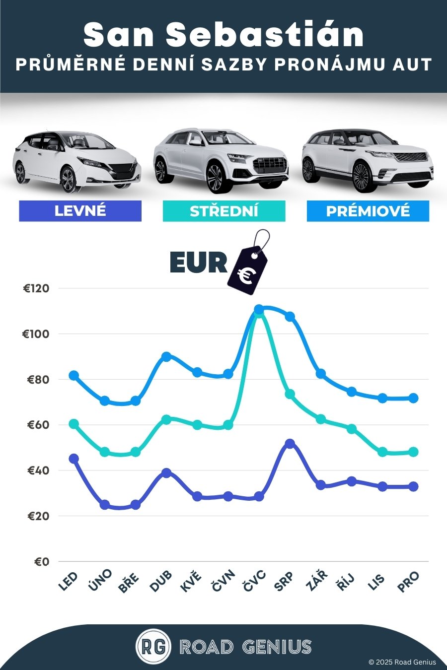 Průměrně stojí pronájem auta v San Sebastiánu přibližně 59 € za den, přičemž nejlevnější pronájmy jsou k dispozici od 25 € za den.