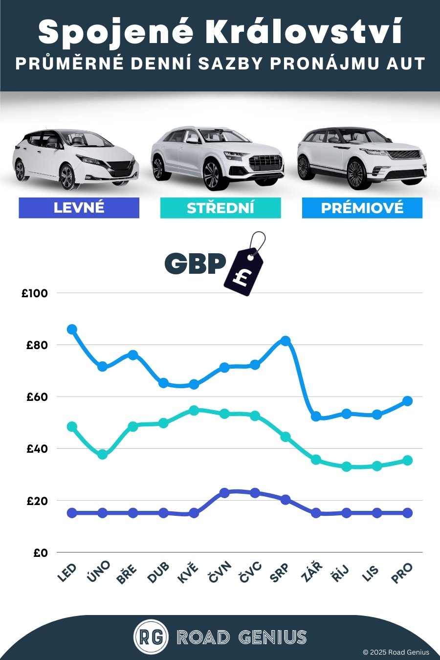 Průměrně stojí pronájem auta ve Spojeném království přibližně 43 € za den, přičemž nejlevnější pronájmy jsou k dispozici od 15 € za den.