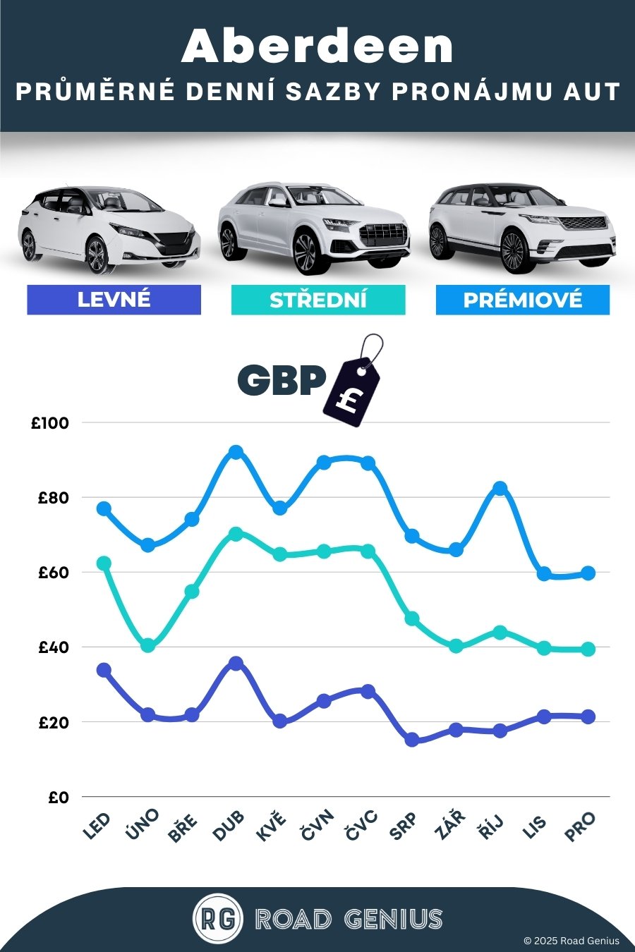 Jaké jsou ceny za půjčení auta v Aberdeenu ve srovnání s jinými skotskými městy? Často zjistíte, že pronájem auta v Aberdeenu je o něco levnější než v Edinburghu nebo Glasgow, protože sem míří méně turistů. Velké obchodní akce však mohou ceny krátkodobě zvýšit.