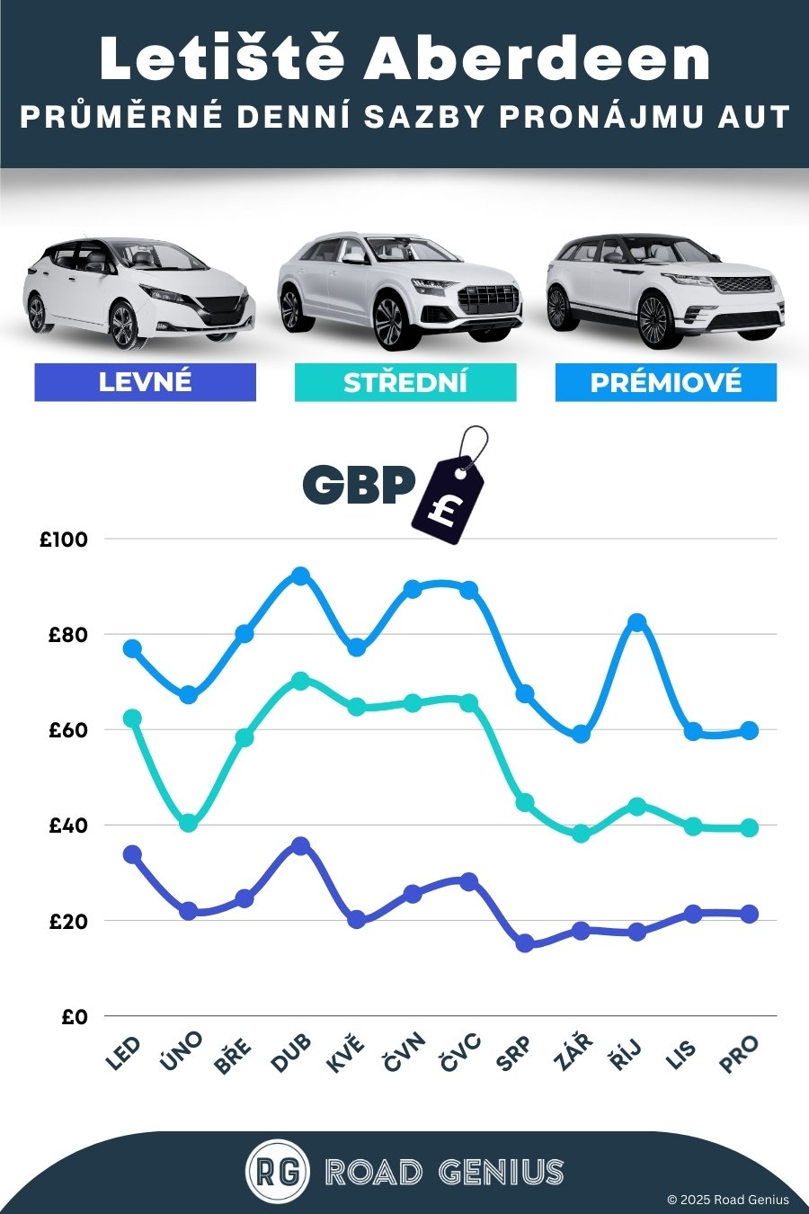 Průměrně stojí pronájem auta na Aberdeen Airport přibližně 50 € za den, přičemž nejlevnější pronájmy jsou k dispozici od 15 € za den.