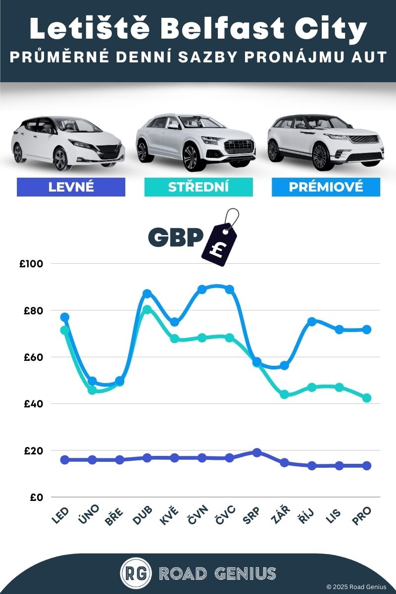 Průměrně stojí pronájem auta na Belfast City Airport přibližně 48 € za den, přičemž nejlevnější pronájmy jsou k dispozici od 13 € za den.