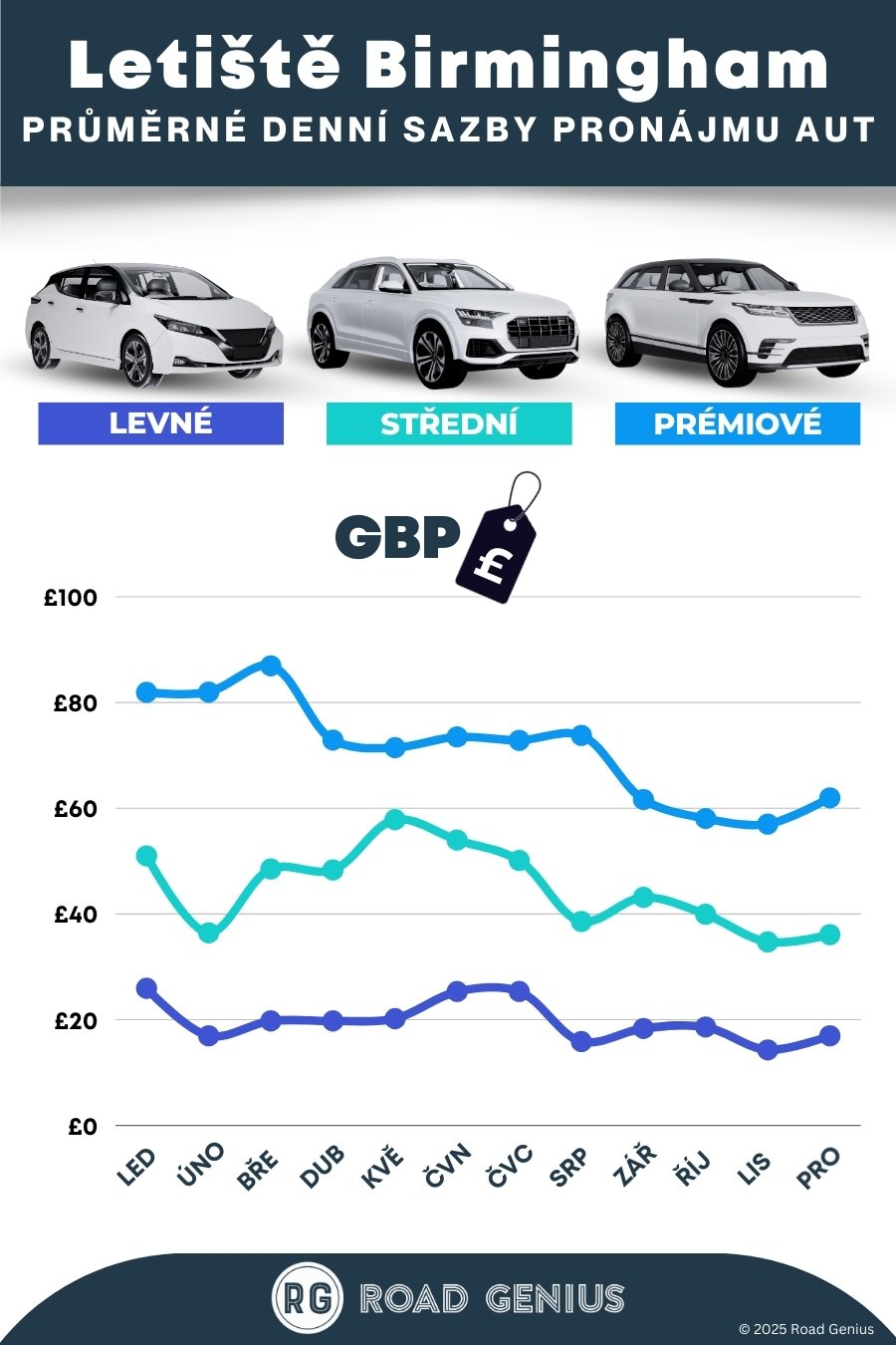 Porovnejte ceny na letišti, mimo letiště a ve městě. Půjčovny na letišti bývají zhruba o 15–20 % dražší. Pokud se nejdříve chystáte do Birminghamu, dojeďte do centra vlakem a auto si pronajměte až tam.