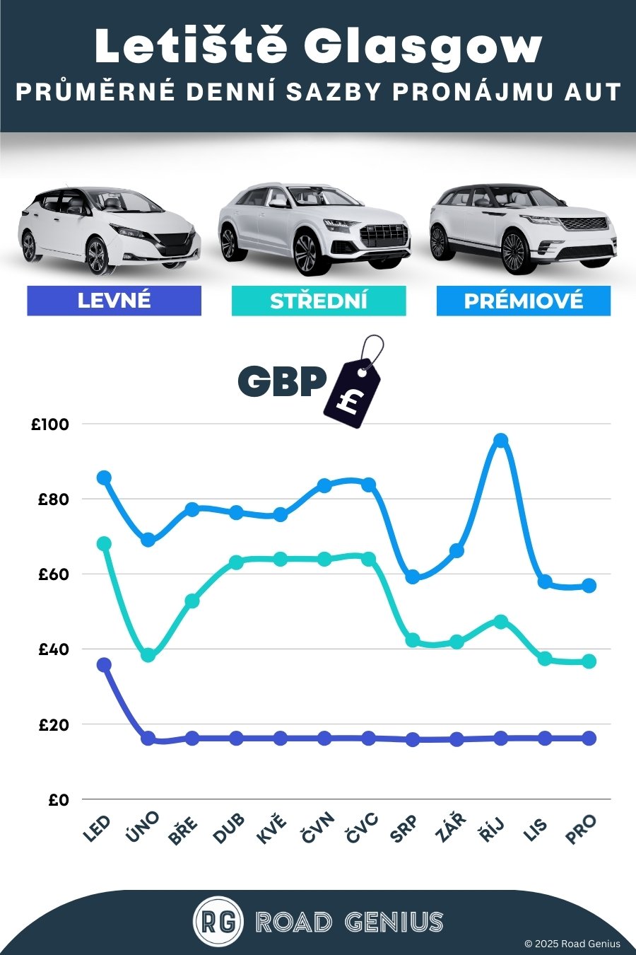 Průměrně stojí pronájem auta na Glasgow Airport přibližně 48 € za den, přičemž nejlevnější pronájmy jsou k dispozici od 16 € za den.