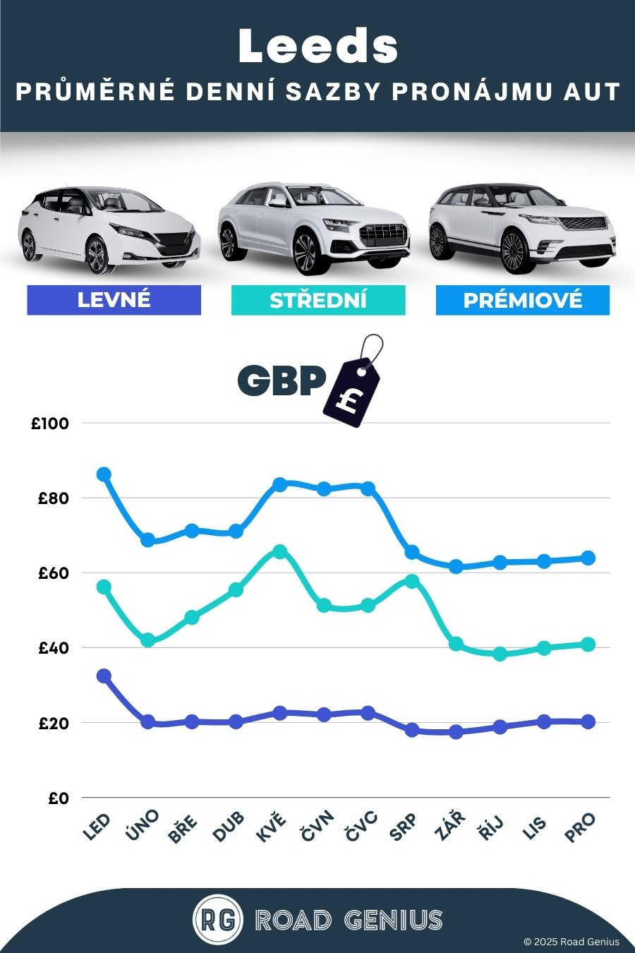 Rezervujte s ohledem na sezónu: V hlavní sezóně (červenec, srpen, prosinec a během Leeds Festivalu) doporučujeme rezervovat vůz 4 až 8 týdnů předem. Mimo sezónu (leden–březen) a v okrajových měsících (duben–květen, říjen–listopad) se vyplatí porovnat ceny pro různá data.