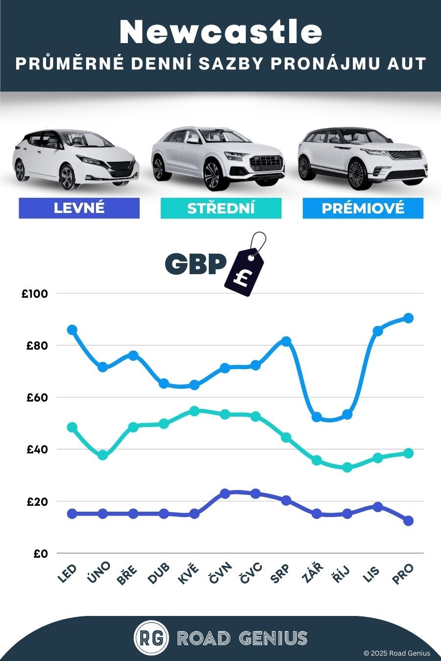Průměrně stojí pronájem auta v Newcastlu přibližně €55 za den, přičemž nejlevnější pronájmy jsou k dispozici od €12 za den.