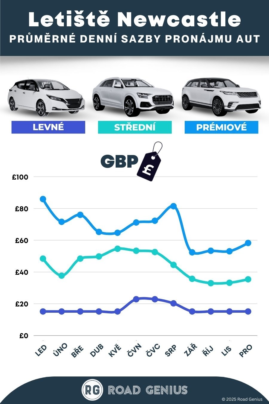 Průměrně stojí pronájem auta na Newcastle Airport přibližně 55 € za den, přičemž nejlevnější pronájmy jsou k dispozici od 12 € za den.