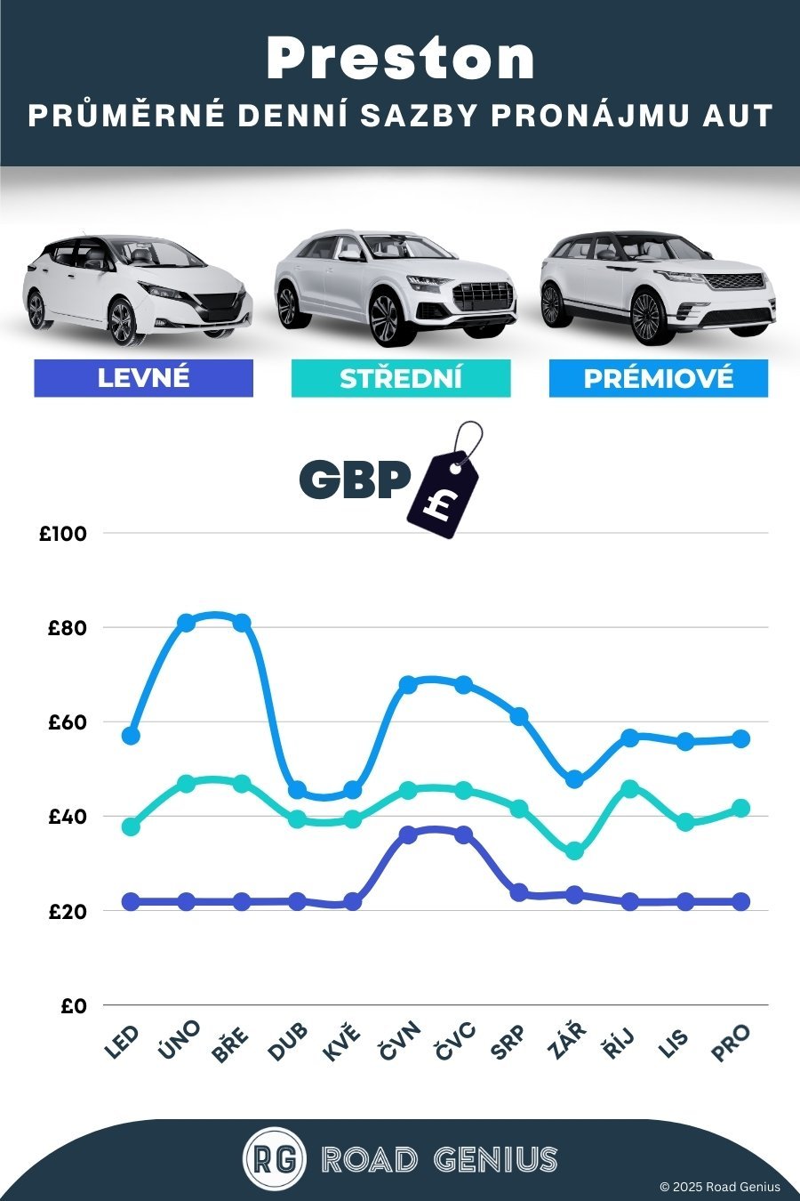 Zvažte změnu termínu: V Prestonu je velká poptávka po autech během pracovního týdne kvůli služebním cestám. Běžně se proto objevují výhodnější nabídky na víkendové pronájmy (pátek–pondělí). V exponovaných obdobích, jako je prosincové nakupování, začátek univerzitního semestru nebo v termínech zápasů místního fotbalového klubu PNE, se vyplatí rezervovat auto s předstihem dvou až tří týdnů.