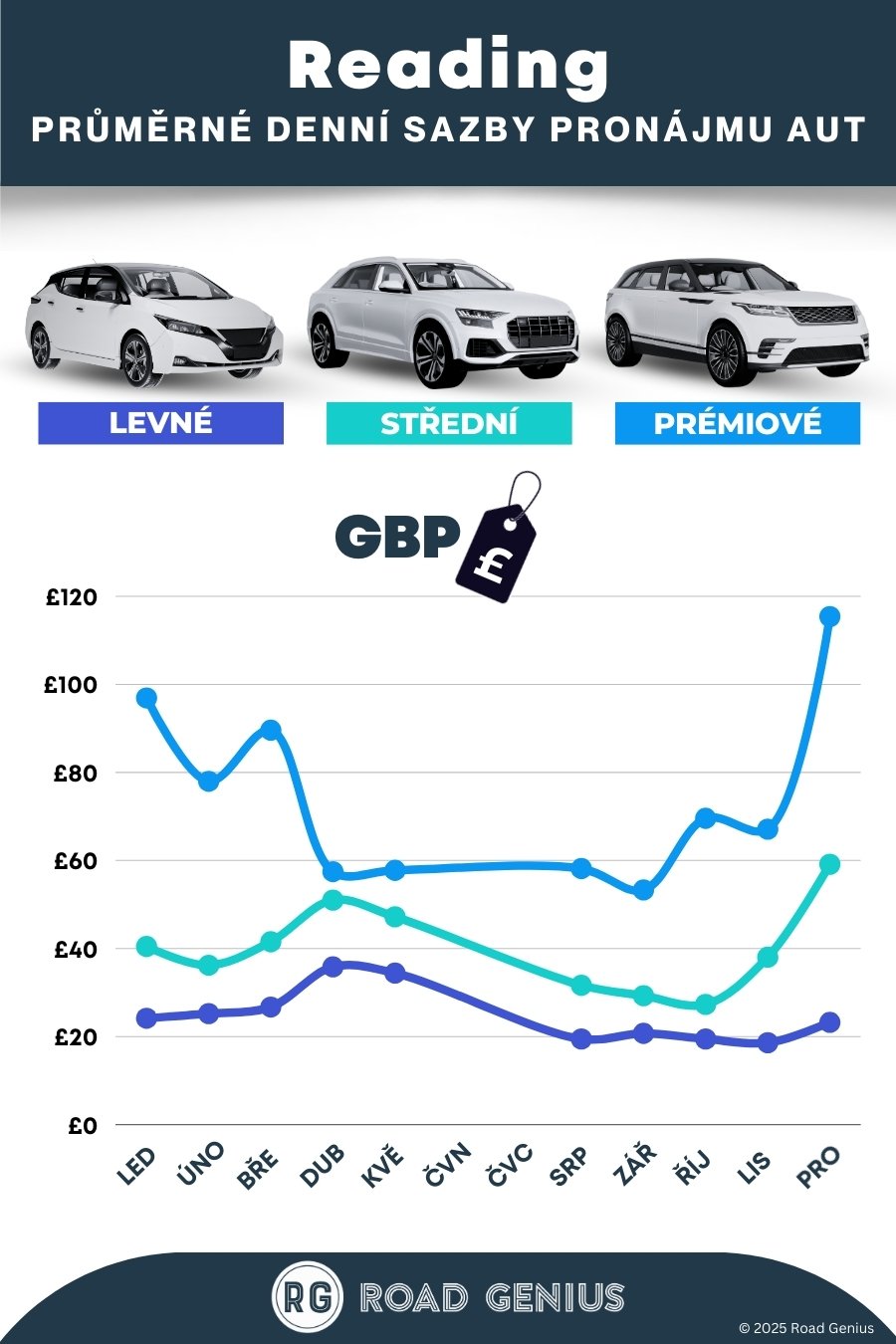 Průměrně stojí pronájem auta v Readingu přibližně £46 za den, přičemž nejlevnější pronájmy jsou k dispozici od £19 za den.