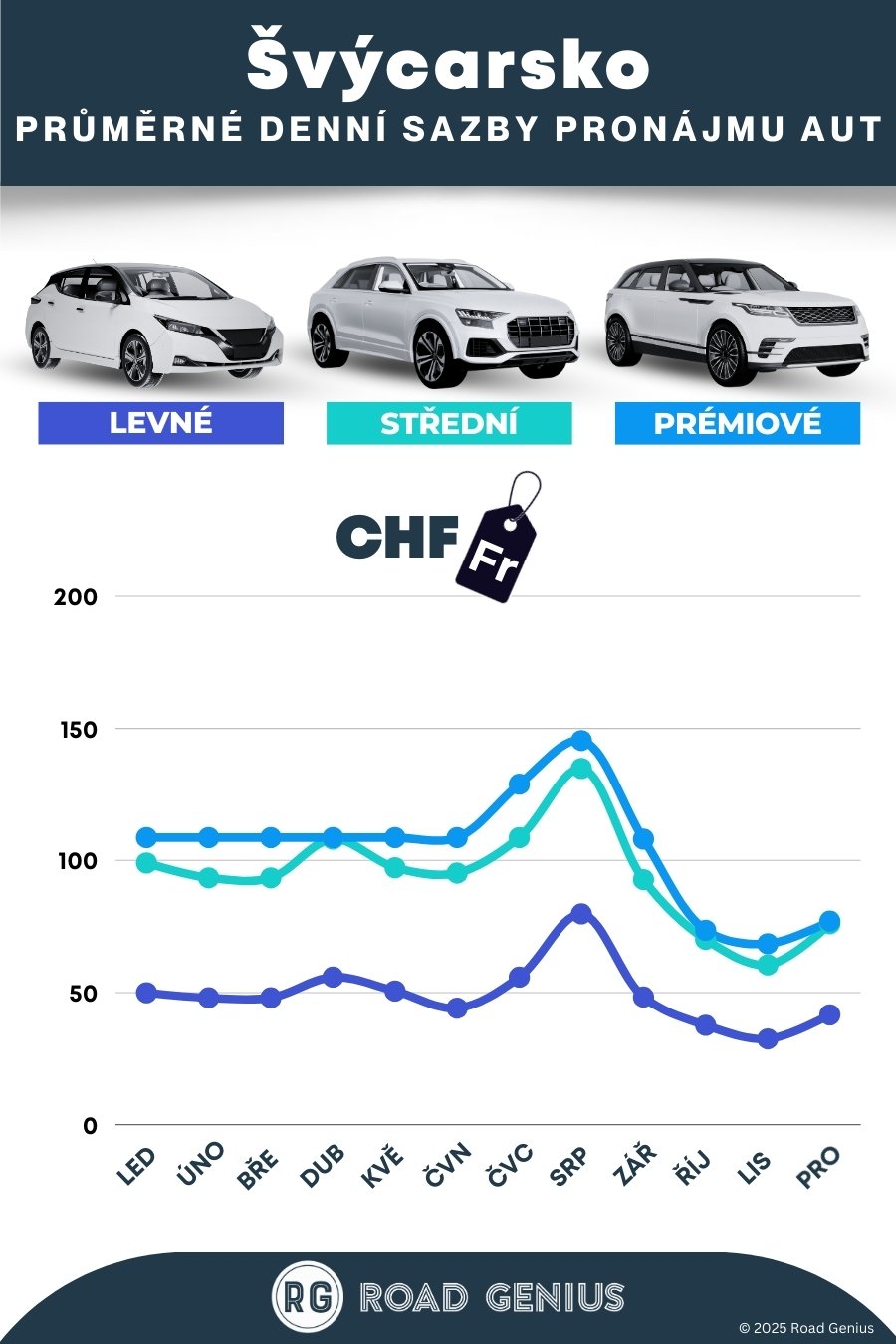 Průměrně stojí pronájem auta ve Švýcarsku přibližně 83 CHF za den, přičemž nejlevnější pronájmy jsou k dispozici od 32 CHF za den.