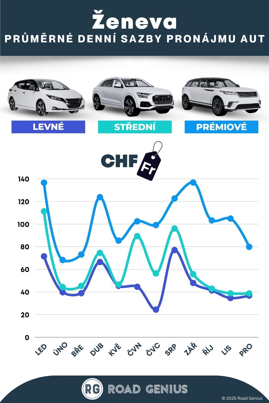 Průměrně stojí pronájem auta v Ženevě přibližně 71 CHF za den, přičemž nejlevnější pronájmy jsou k dispozici od 24 CHF za den.