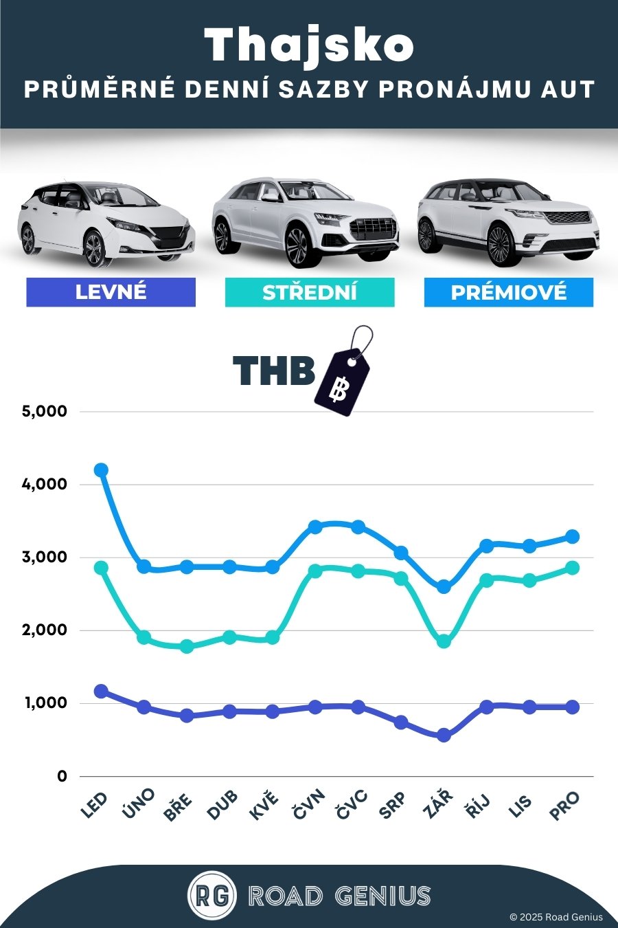 Průměrně stojí pronájem auta v Thajsku přibližně 2 150 THB za den, přičemž nejlevnější pronájmy jsou k dispozici od 566 THB za den.