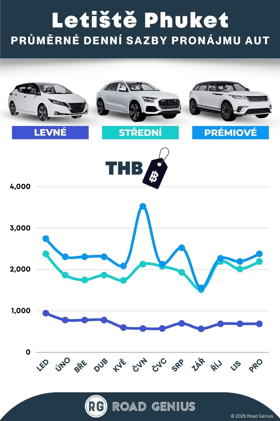 Průměrně stojí pronájem auta na Phuket Airport přibližně 1 676 THB za den, přičemž nejlevnější pronájmy jsou k dispozici od 566 THB za den.