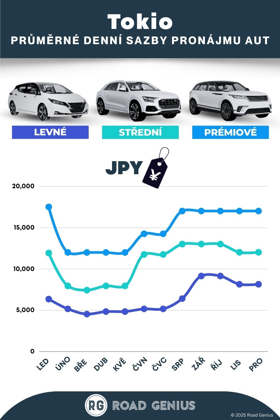 Průměrně stojí pronájem auta v Tokiu přibližně 10 734 JPY za den, přičemž nejlevnější pronájmy jsou k dispozici od 4 546 JPY za den.
