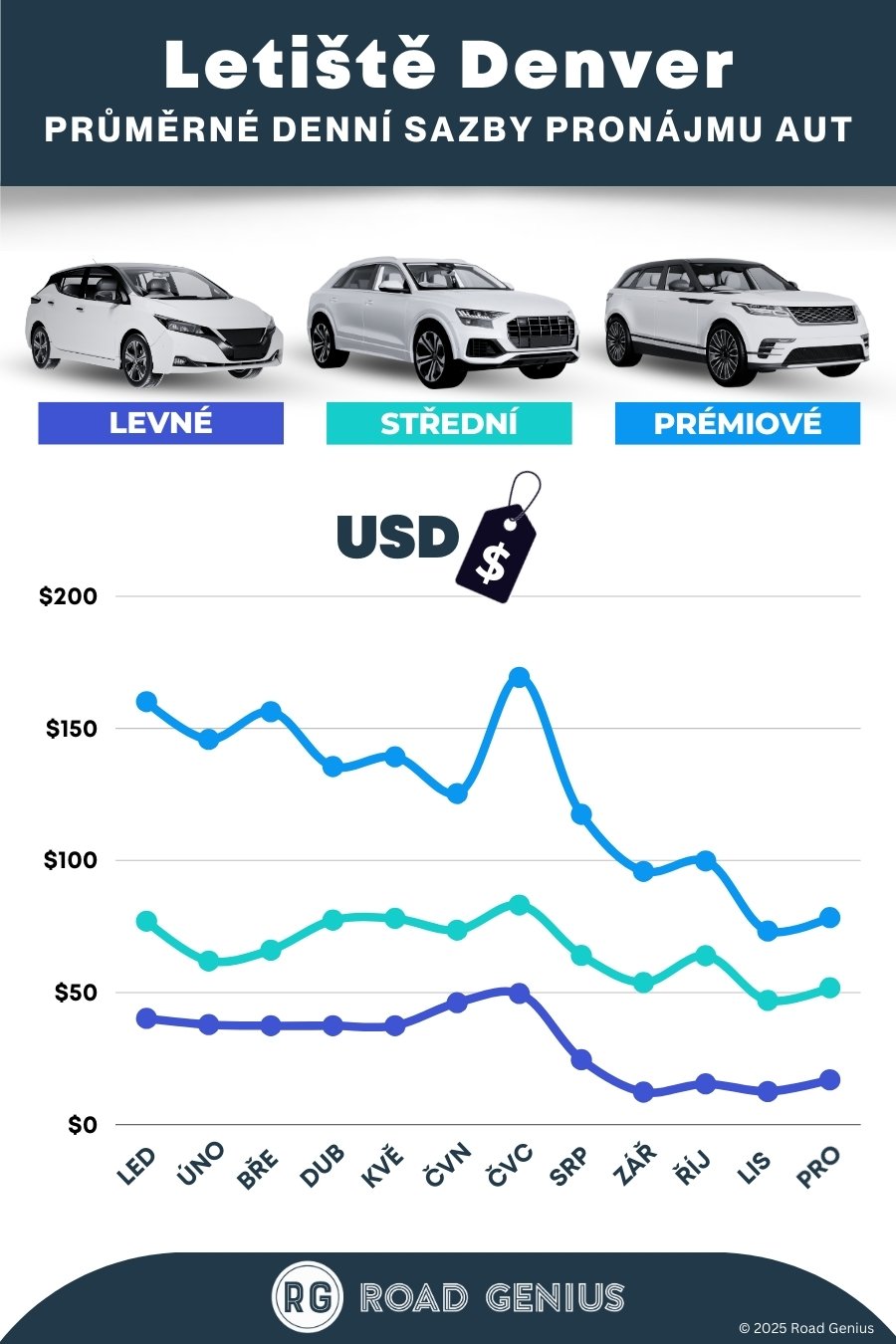 Průměrně stojí pronájem auta na Denver Airport přibližně 74 USD za den, přičemž nejlevnější pronájmy jsou k dispozici od 12 USD za den.