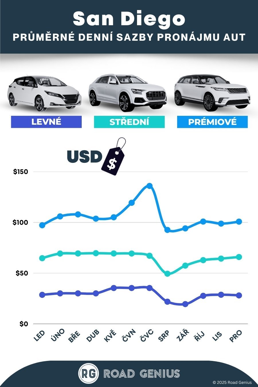 Průměrně stojí pronájem auta v San Diegu přibližně USD 66 za den, přičemž nejlevnější pronájmy jsou k dispozici od USD 19 za den.