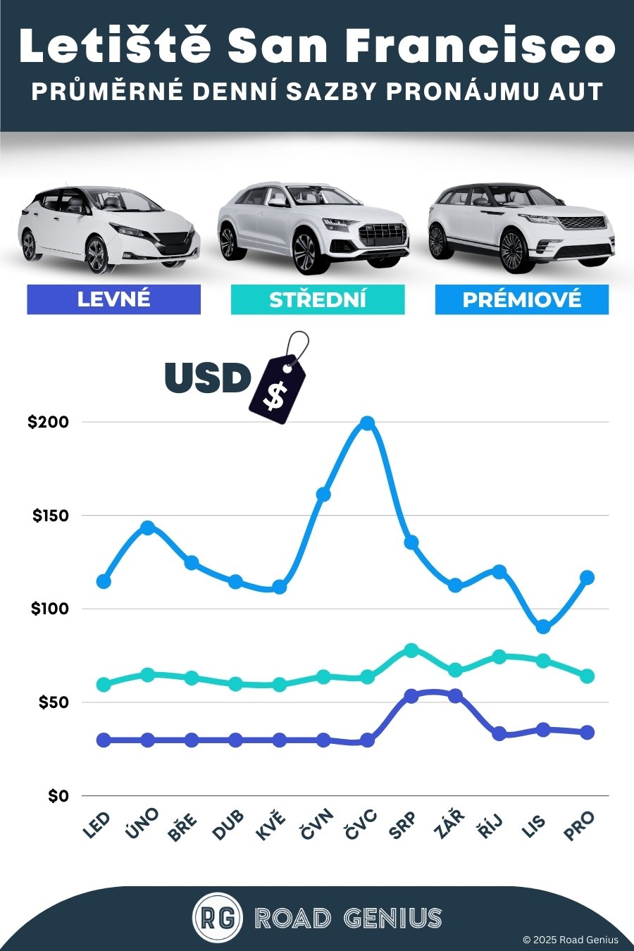 Průměrně stojí pronájem auta na San Francisco Airport přibližně 76 USD za den, přičemž nejlevnější pronájmy jsou k dispozici od 30 USD za den.