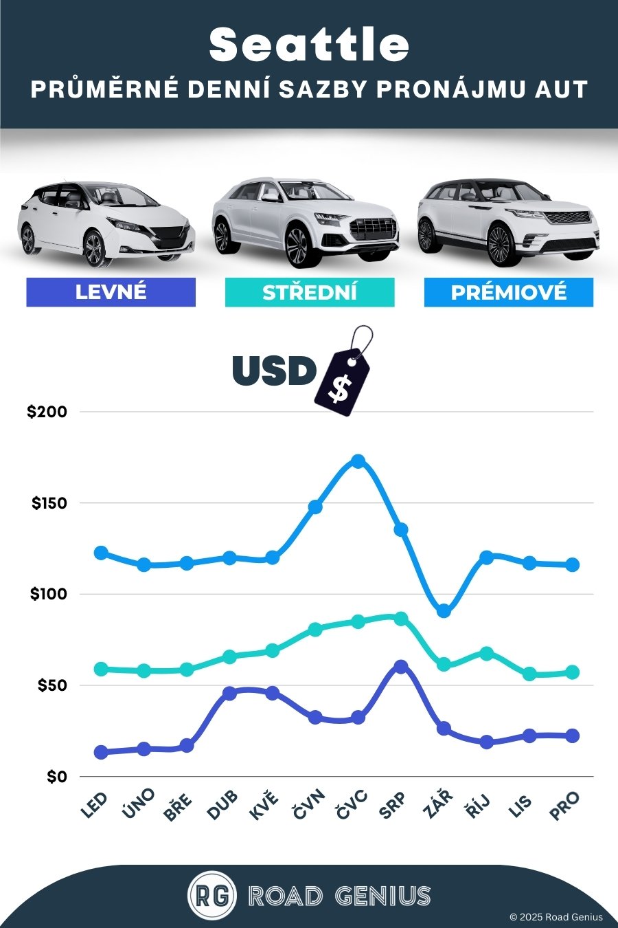Průměrně stojí pronájem auta v Seattlu přibližně 74 USD za den, přičemž nejlevnější pronájmy jsou k dispozici od 13 USD za den.