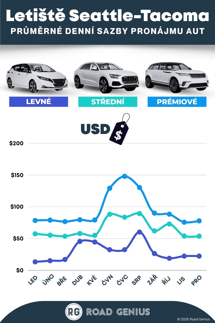 Průměrně stojí pronájem auta na Seattle–Tacoma Airport přibližně 63 USD za den, přičemž nejlevnější pronájmy jsou k dispozici od 13 USD za den.