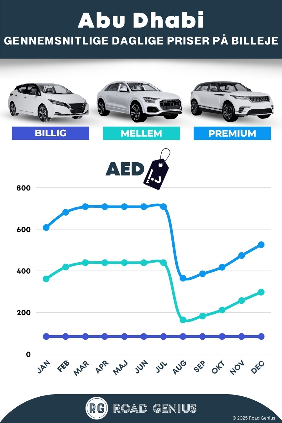I gennemsnit koster billeje i Abu Dhabi omkring 362 AED pr. dag, og de billigste lejebiler fås fra 39 AED pr. dag.